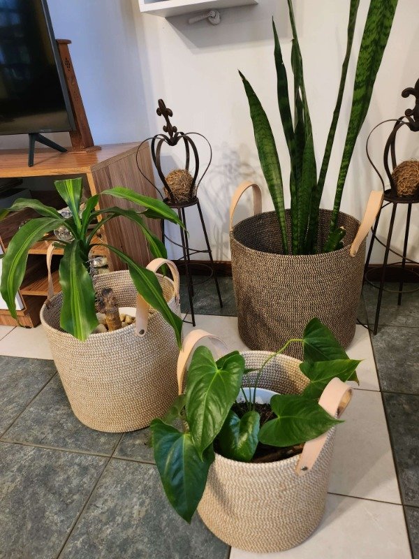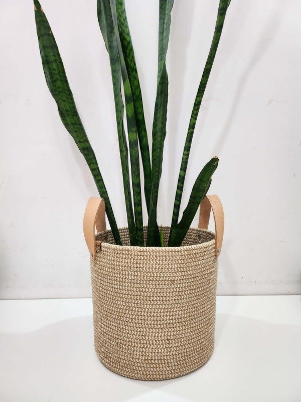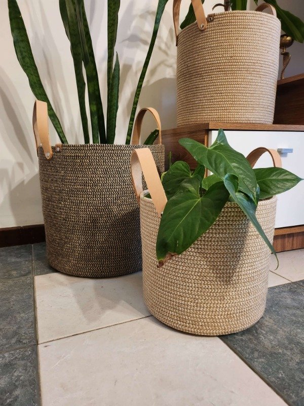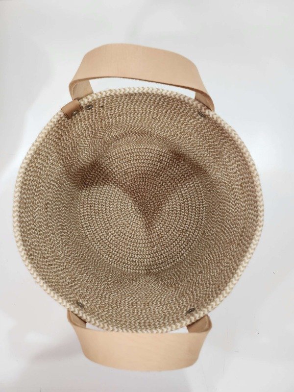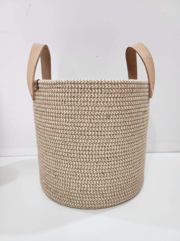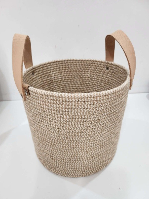Cesta redonda confeccionada en cordón de yute natural y algodón en zigzag, puede ser en crudo o en negro, con manijas de vacuno natural con remaches.