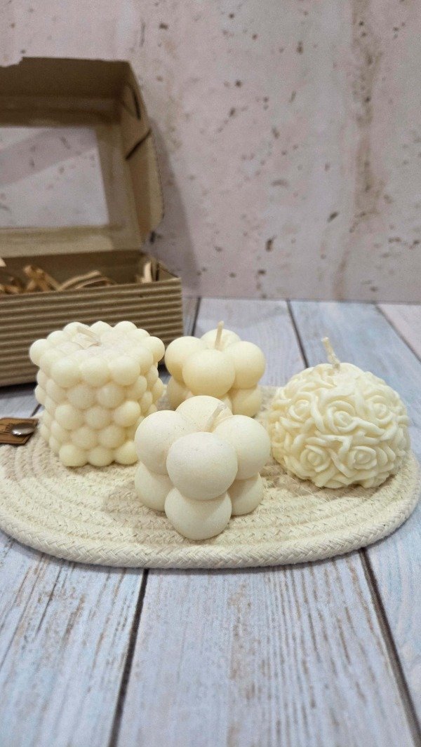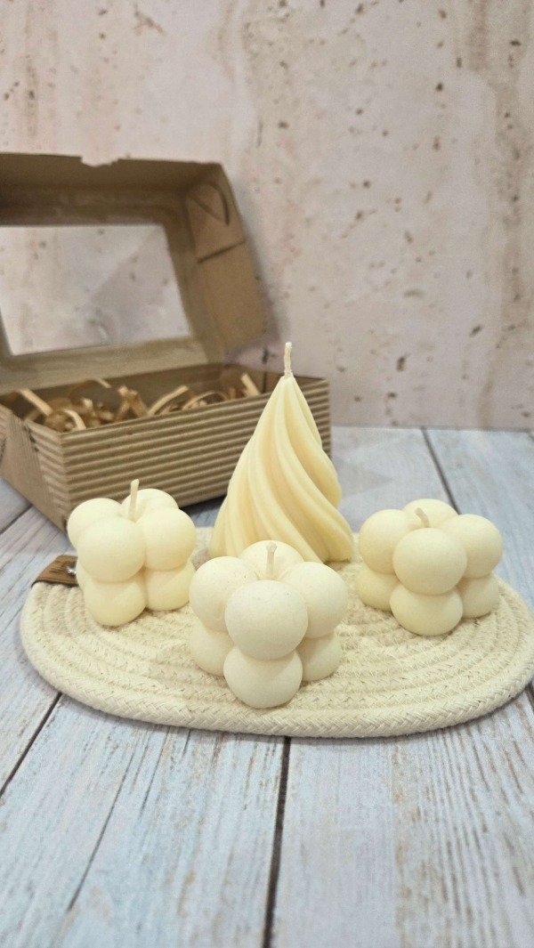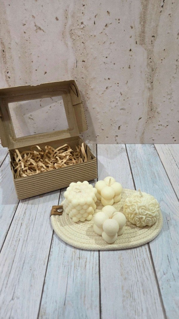 Velas aromáticas x 4 con formas, en caja de cartón y posa velas, caja de 16x11cm