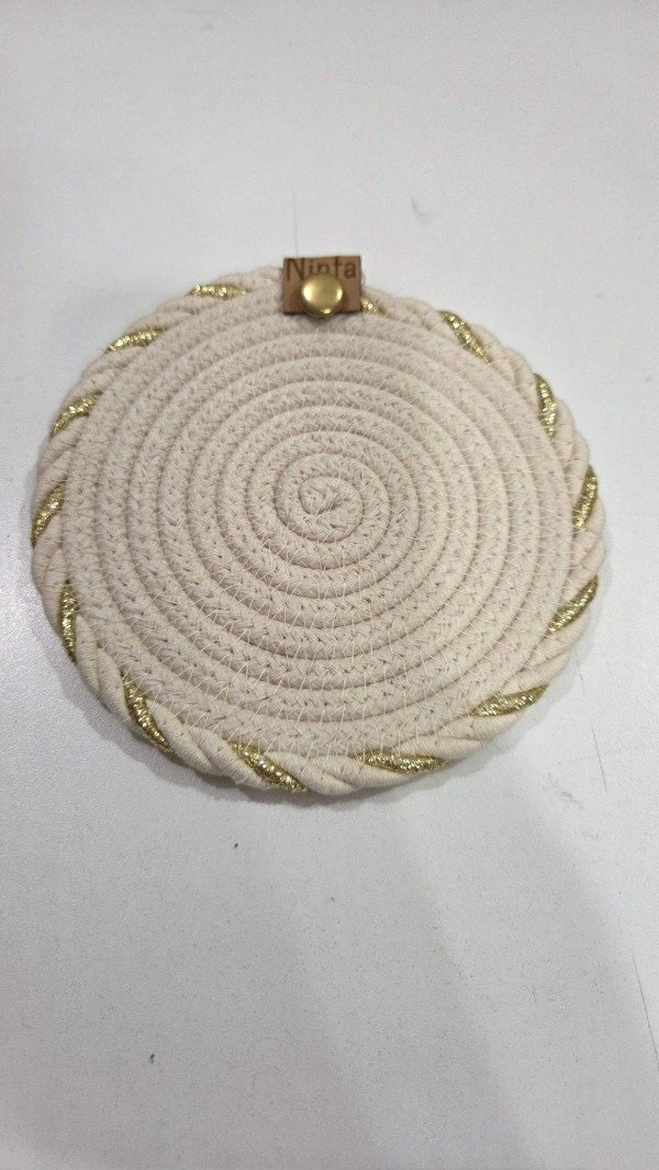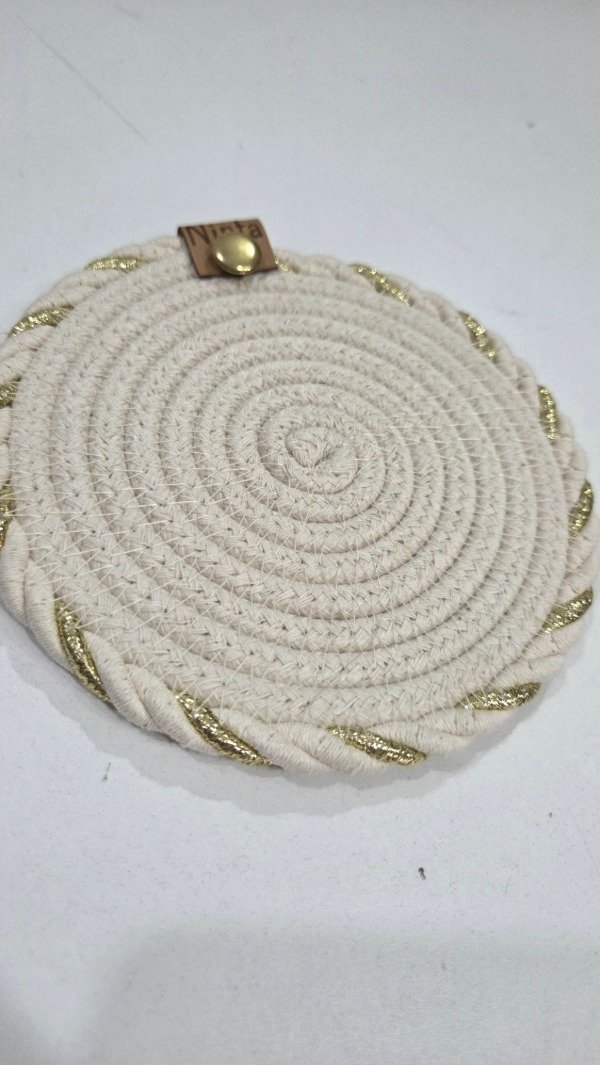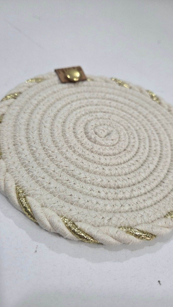 Posa vasos de 13cm de diámetro en cordón de algodón premium con borde de cordón retorcido dorado y crudo